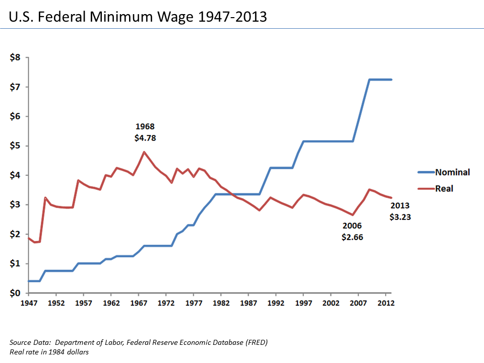 This idea is clearly absurd. However, real absolute standards suffer the same problem of not keeping up with a changing world. The minimum wage, for example, is always steadily falling behind inflation and the rising costs of living. Note in the graph how every time Congress raises the minimum wage its real value (in red) slants back down again until the next legislative bump. Because of such slants, its overall value has actually been steadily declining since the late 1960’s (a 33.2% percent drop, to be specific).19,20 Making this drop in value even more ridiculous, it took place while the inflation-adjusted GDP created by the average US worker doubled.21,22 Our workers are twice as valuable yet somehow paid less. Clearly the minimum wage hasn’t kept up with economic reality at all.